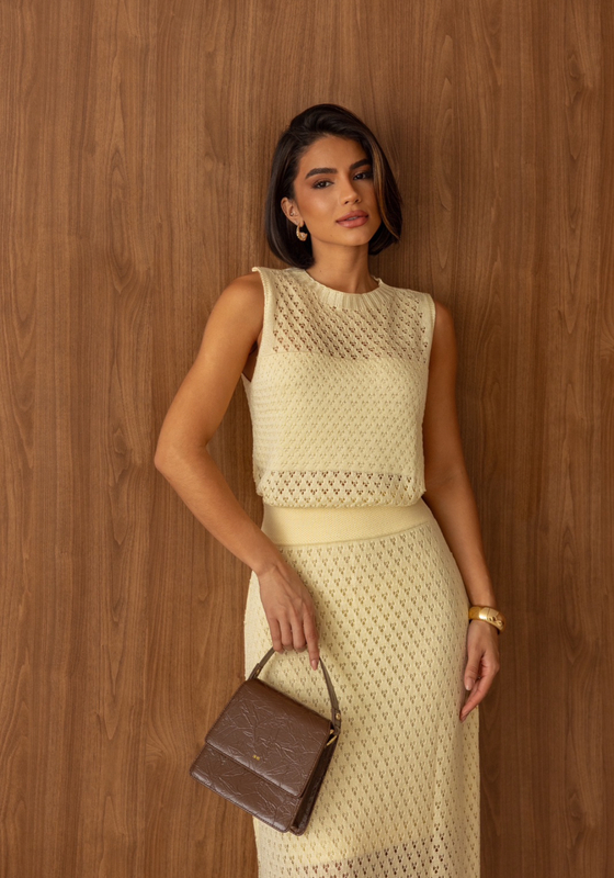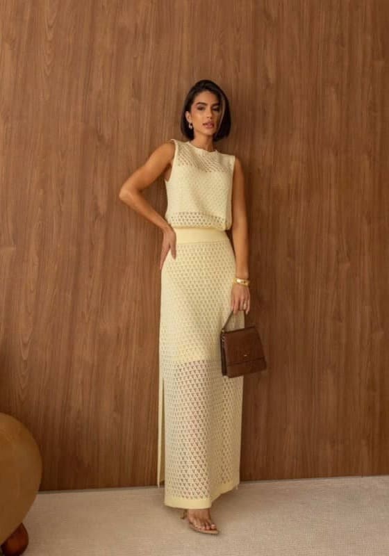 Conjunto em tricô, saia com fenda e blusa sem manga.